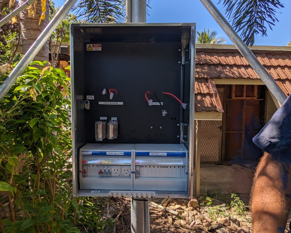 Our Cairns electricians efficiently managed the removal of the switchboard to this flood-damaged property to allow for demolition works. We then supplied and installed a certified temporary property pole, which now services both the demolition of the existing flood-damaged dwelling and the construction of a new replacement dwelling. Additionally, we organized the necessary service connections and liaised with the energy provider to ensure a smooth transition to temporary power. This coordination minimized downtime and disruption, maintaining power for an additional rear dwelling and ensuring continuity for the tenant.