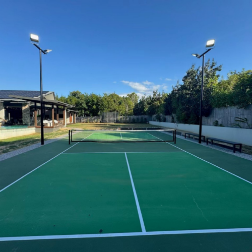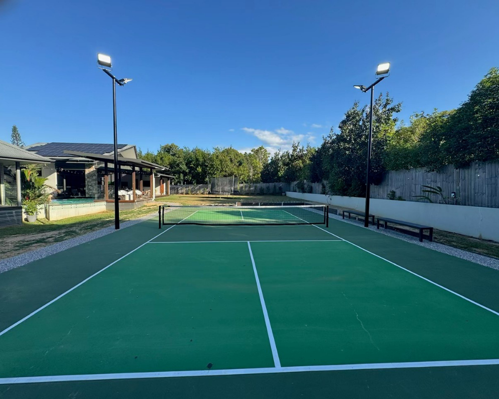 Huzgroup Electrical completed the full design and construction of lighting poles and fittings for a newly built private pickleball court. The project included the supply and installation of high-grade commercial light fittings with extreme weather ratings, ensuring long-term durability and performance in tropical conditions. Black powder-coated light poles with custom cross arms were installed to provide a sleek, professional finish. A detailed lighting plan was developed to meet recreational tennis lighting standards and light spill requirements, ensuring optimal visibility and minimal environmental impact.